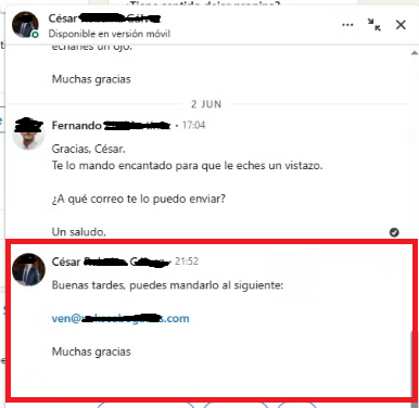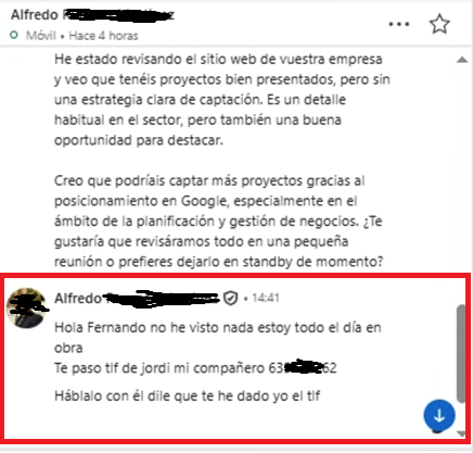 Perfil profesional del cliente Fernando Pla gestionado por el equipo interno de la campaña, con mensajes orientados a conectar con responsables de asociaciones y obtener respuestas de interés