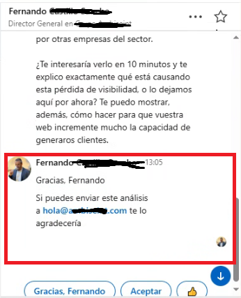 Captación de oportunidades B2B en LinkedIn para vender servicios SEO, iniciando conversaciones reales con perfiles decisores y dando seguimiento hasta detectar interés comercial.