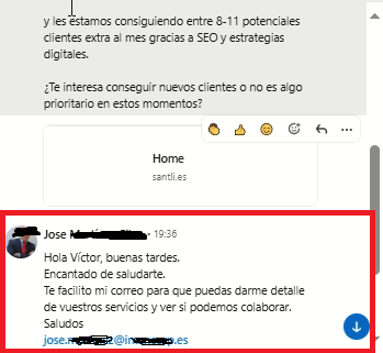 Captación de oportunidades B2B en LinkedIn, iniciando conversaciones directas con decisores para presentar servicios de SEO orientados a mejorar su visibilidad online y atraer más clientes, detectando interés real.